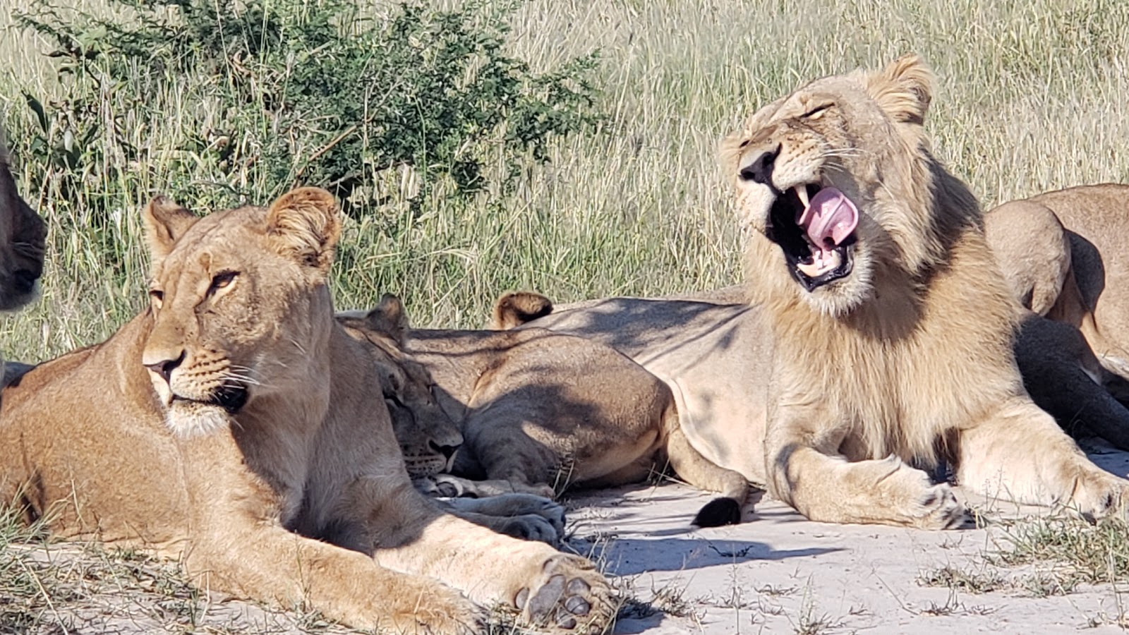 At around 6pm the camp guard told us of a lion kill nearby, so we all bailed into the Troopy and it was right next to the main tar road , twenty feet inside the bush. Two lioness killed a fully grown Kudu and the seven cubs were trying to eat it as the mothers watched there feeble attempt at trying to eat it. It had hardly been touched, then suddenly the one lioness went over and dragged it a metre more into the bush and then was joined by the other one and then started tearing into it and you could hear the teeth breaking into the skin and bones. It was getting dark but luckily had a torch and was able to watch for a little longer and then headed back to camp, where they had started a fire for me for the nightly braai.